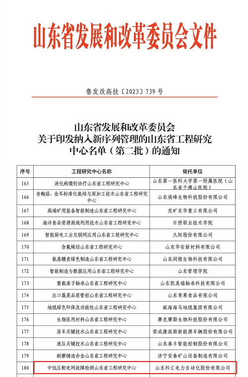 科汇公司中低压配电网故障检测山东省工程研究中心纳入山东省新序列管理